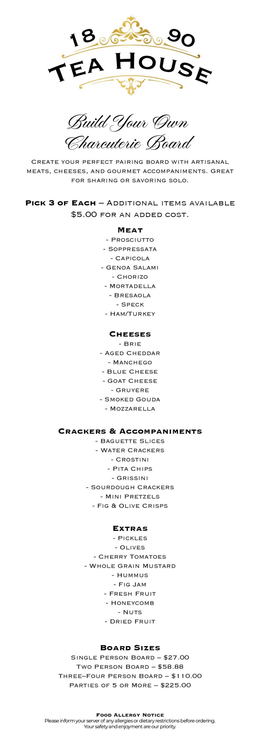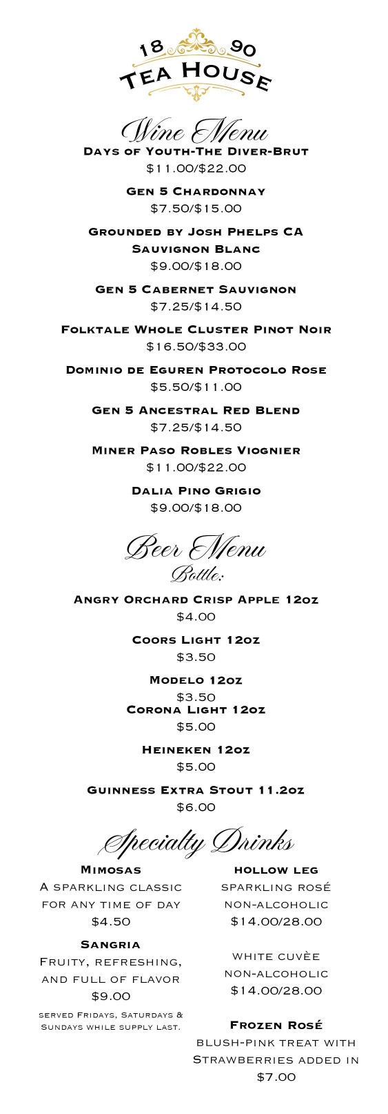 We’re delighted to welcome you to 1890 Tea House! While we prepare for our grand opening, we invite you to enjoy our current menu of Gourmet Tea Sandwiches, Charcuterie Boards, Teas, Wine, Beer, and more.